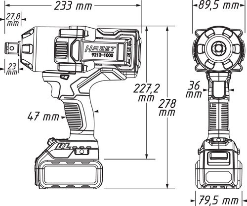 | hriadeľ max. povoľovací moment max. uťahovací moment otáčky vľavo / vpravo výkonové stupne: 1. stupeň 2. stupeň 3. stupeň akumulátorová batéria doba nabíjania hladina hluku vibračné zrýchlenie hmotnosť: prístroj bez akumulátora prístroj s akumulátorom sada v kufri |