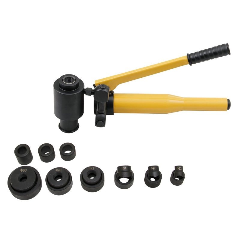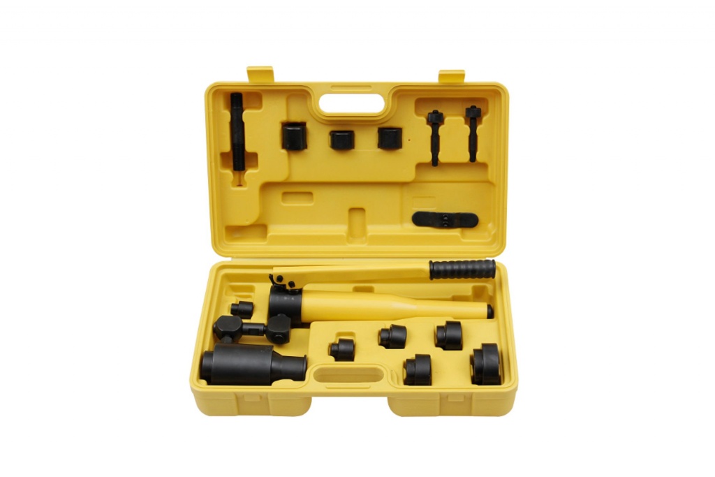 sada v plastovom kufri obsahuje hydraulický ručný pákový dierovač a príslušná razidlá / dierovače a adaptéry