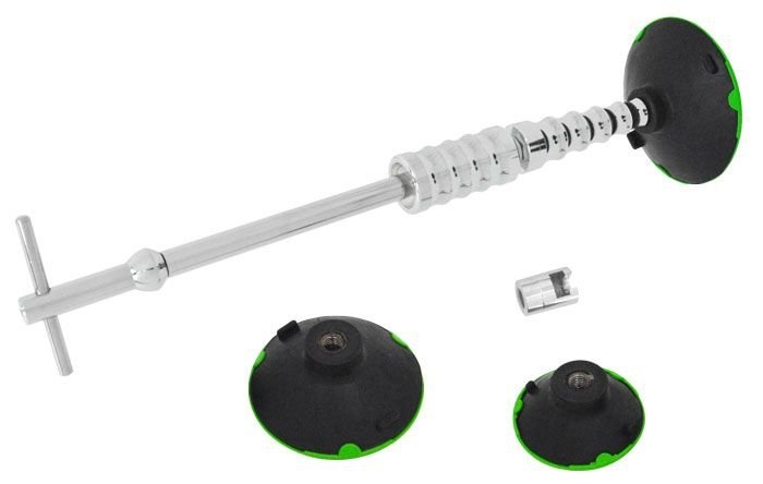 Klzné vyťahovacie kladivo s 3 prísavkami Ø 75, 100, 125 mm a so skrutkovacou koncovkou pre uchytenie nalepených vyťahovacích adaptérov pre odstraňovanie preliačin karosérií.
