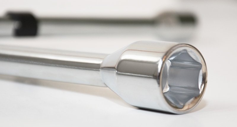Krížový kľúč na matice / skrutky kolies zo špeciálnej chróm-vanádiovej ocele s hlavicami 17/19/21 mm šesťhran a ½" štvorhran.