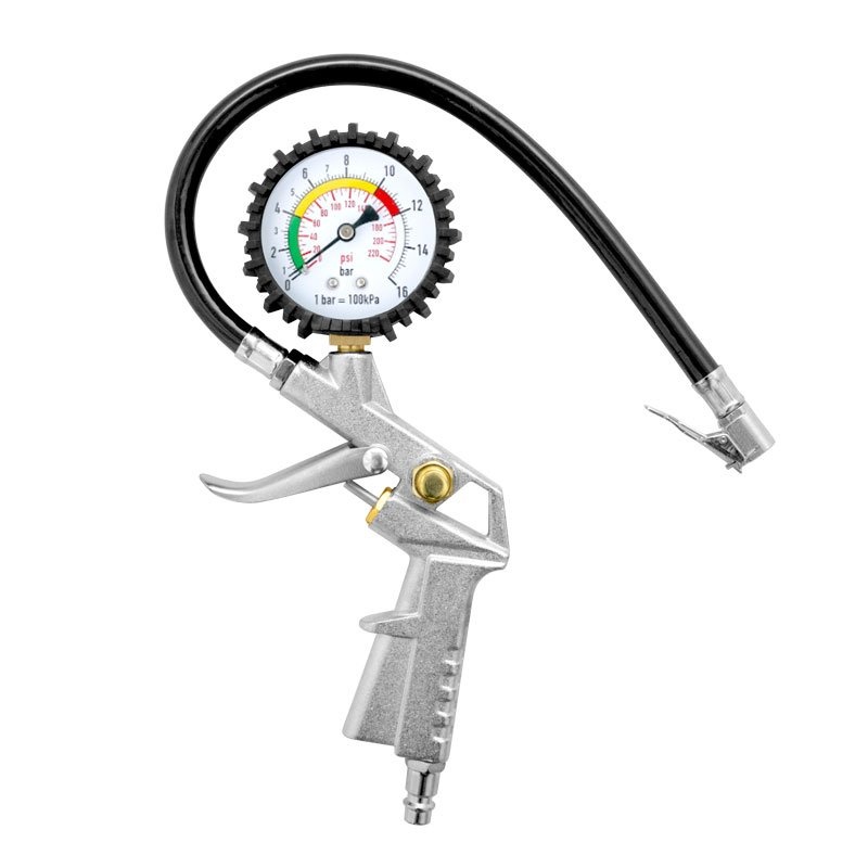 Štandardný pneuhustič s tlakomerom na kontrolu tlaku v pneumatikách a ich dohustenie príp. upustenie. Dobre čitateľný analógový tlakomer so stupnicami v bar a psi má ochranný gumový plášť pohlcujúci mechanické nárazy. Pružná hadička dl. 30 cm s rýchloupínacou páčkou. Pripojenie na stlačený vzduch pomocou rýchlospojky 1/4".