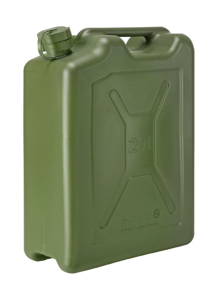 Vysokokvalitný plastový kanister s objemom 20 litrov s pružným výtokovým nadstavcom umiestneným v nádobe a integrovaným vetraním má rozmery identické s klasickým armádnym kanistrom.