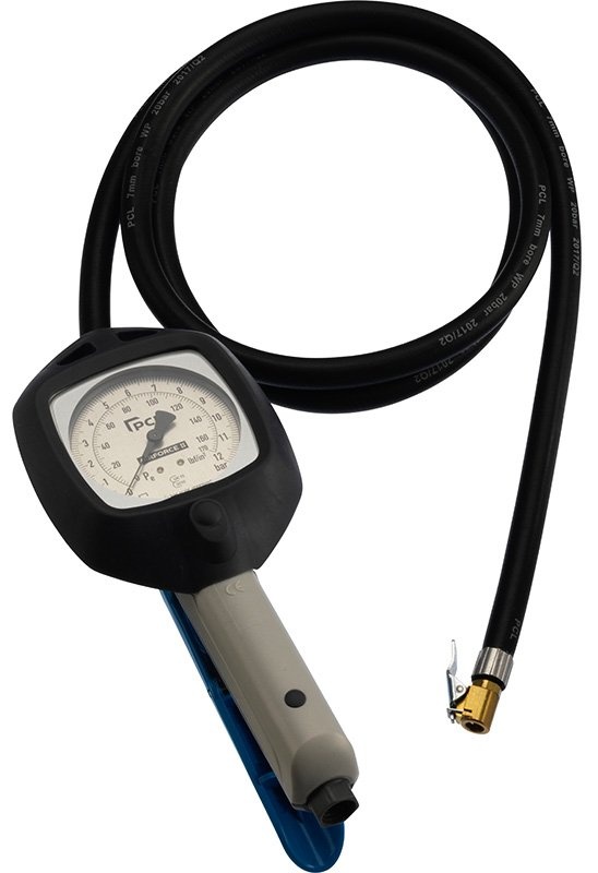 Parametre: rozsah 0 - 12 bar, hadica 2,7 m, koncovka Euro Clip-on - koncovka s páčkovým zaistením s otvoreným koncom, ktorá sa pripne a drží na ventile pneumatiky, má kolík, ktorý pri nasadení uvoľní ventil pneumatiky a tú možno tak nahustiť na požadovaný tlak, štandardné koncovka pre pneuhustiče v pneuservisoch, autoservisoch, na čerpacích staniciach, atď.