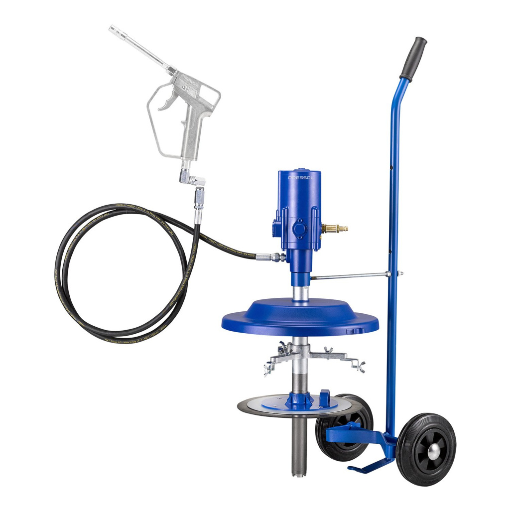 Pojazdný pneumatický mazací prístroj pre plastické mazivá v baleniach / vedrách 15 kg (Ø 240 - 270 mm) je vybavený vynikajúcim pneumatickým vysokotlakým čerpadlom na plastické mazivá (mazacie tuky) 50:1. Jeho patentovaná konštrukcia poslednej generácie garantuje extrémne dlhú životnosť, vysoký výkon, malú hlučnosť a úplne mimoriadnu spoľahlivosť aj za najťažších prevádzkových podmienok. Má minimálny počet pohyblivých dielov, čo uľahčuje prípadný servis.