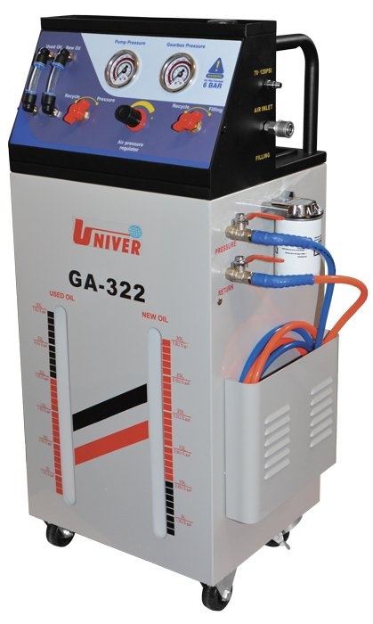 Pojazdný prístroj pre výmenu oleja v automatických prevodovkách umožňuje odobratie opotrebovaného oleja z automatických prevodoviek, ich preplach / čistenie a naplnenie novým olejom. Prístroj sa skladá z pojazdné skrine so zásobníkmi pre opotrebovaný aj nový olej, pneumatické časti a ovládacieho pultu v hornej časti.