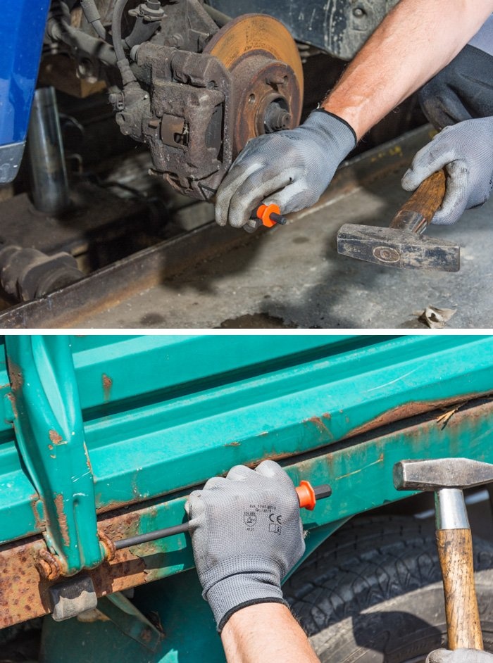 7-dielna sada priebojníkov / vyrážačov závlačiek s dvojkomponentnou rukoväťou dl. 140 až 220 mm a priemerom 2 až 8 mm.