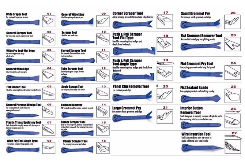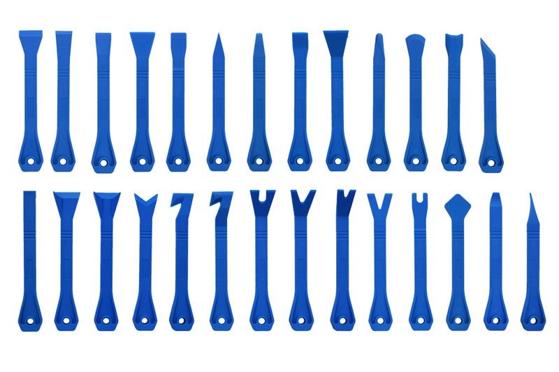 27-dielna sada plastových prípravkov pre demontáž príchytiek čalúnenia a ozdobných líšt, pre odstraňovanie tesnení, zvyškov lepidiel a pod.