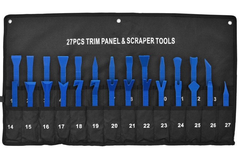 27-dielna sada plastových nástrojov v praktickom vaku pre demontáž príchytiek čalúnenia a ozdobných líšt a tiež pre odstraňovanie tesnení, zvyškov lepidiel a pod.