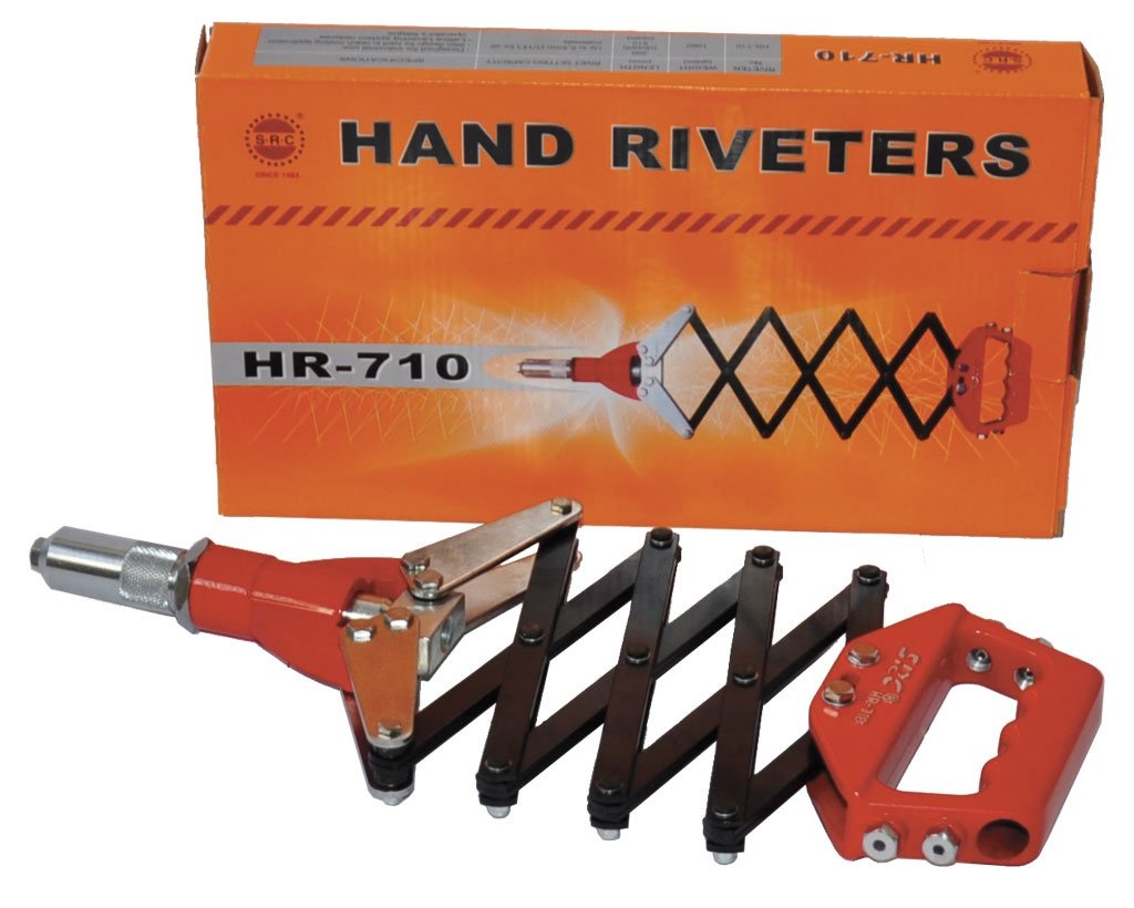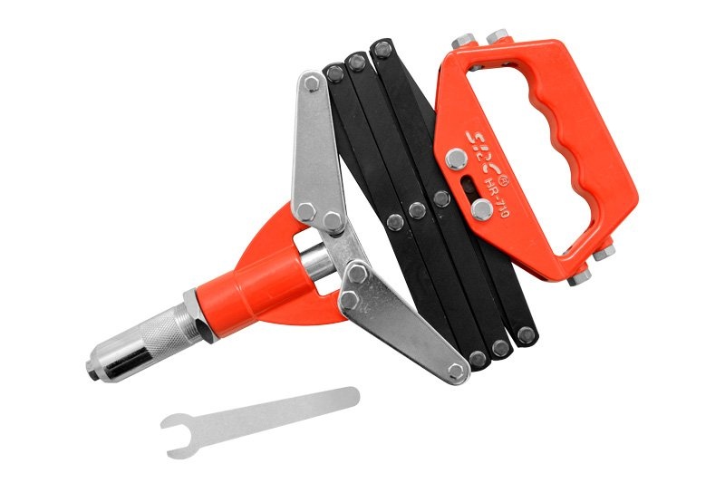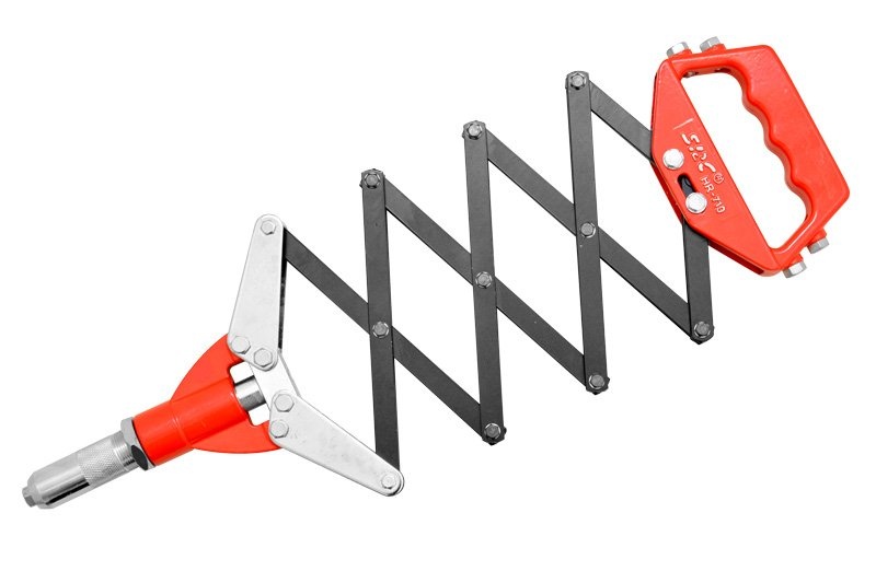 Jednoručné nožnicové / harmonikové kliešte na nitovanie štandardnými trhaciemi nity Ø 3,2 mm, 4,0 mm, 4,8 mm, 6,0 mm a 6,4 mm zo všetkých bežných materiálov (najmä hliník, oceľ a nerezová oceľ). < br /> Kliešte majú skriňu zo špeciálnej tlakovej alumíniovej zliatiny v kombinácii s kovanou oceľou, kvalitnú práškovú povrchovú úpravu, 5 vymeniteľných vložiek (puzdier) pre rôzne priemery nitov a kľúč k nim. Tieto nitovacie kliešte sú vybavené nožnicovým / harmonikovým usporiadaním páky so štvornásobným uložením prevodu, čo značne znižuje nároky na veľkosť sily pri nitovaniu.