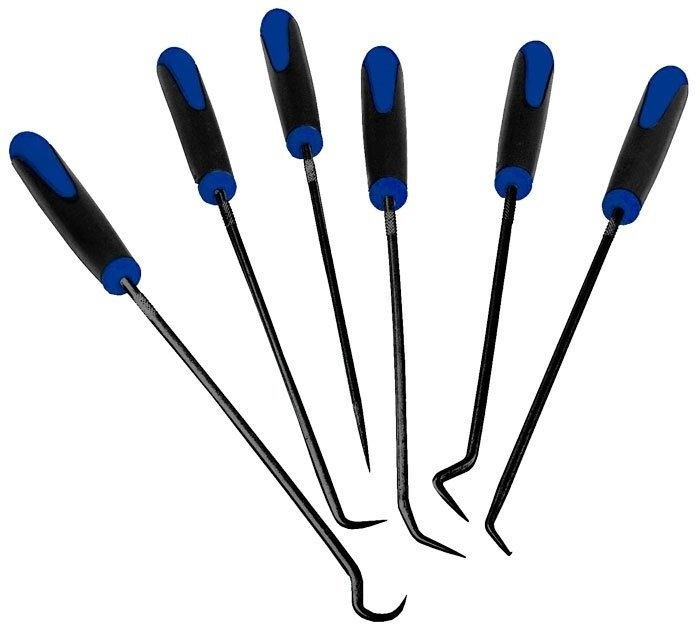 Sada 6 ks rôzne tvarovaných kovových háčikov a hrotu pre široké uplatnenie. Náradie je možné použiť na demontáž O-krúžkov, gufier, simmeringov a pod., ale aj na modelárske práce, práce s drevom, čistenie medzier a pod.