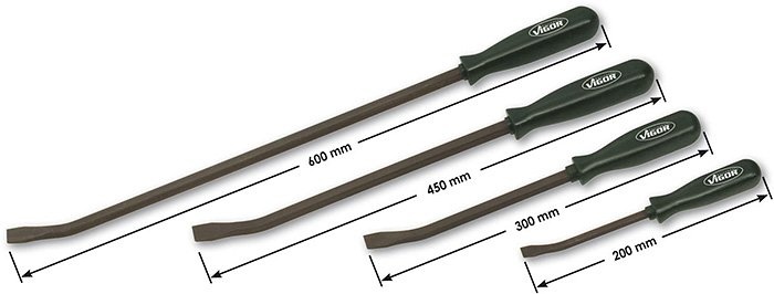 4-dielna sada nástrojov pre páčenie vysokej kvality (dcérska firma HAZET / Nemecko) obsahuje 4 páčidlá (veľkosti: 200 mm, 300 mm, 450 mm a 600 mm) s ergonomickým držadlom a kovovou časťou s koncovým splošteným vyhnutím. Koniec držadla je odolný aj pri údere kladivom.