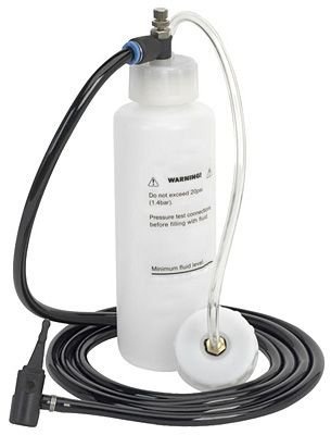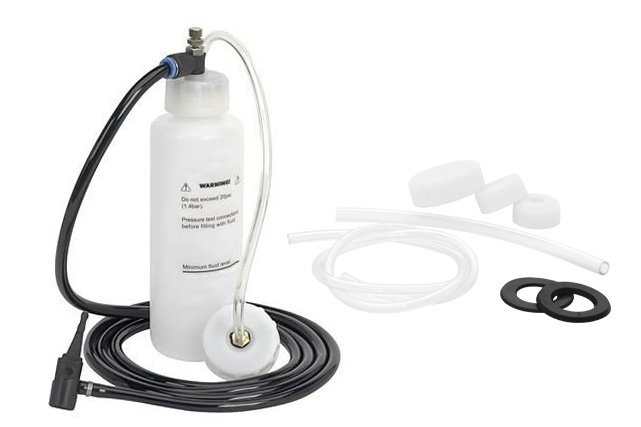 Plastová nádoba 500 ml s ventilom, s magnetickou spodnou časťou as dlhou pripojovacou hadicou na pneumatiku a tiež 4 adaptéry (viečka a tesnenia) na preplach a odvzdušňovanie bŕzd a spojok.