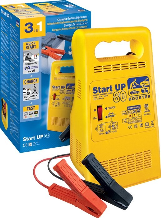 Ako nabíjací zdroj slúži GYS Start UP 80 k automatickému nabíjaniu všetkých druhov štartovacích batérií od 45 Ah do 170 Ah (olovené, gélové, kalciové atď.).