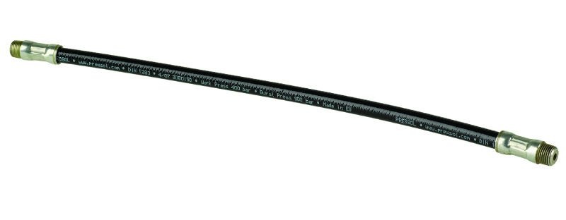 Vysokotlaková pancierová hadica 8 x 230 mm s polyuretánovým plášťom bez hubice, obojstranný vonkajší závit G 1/8", minimálny tlak pre roztrhnutie 900 bar, Ø 11 mm, dĺžka 230 mm, DIN 1283.
