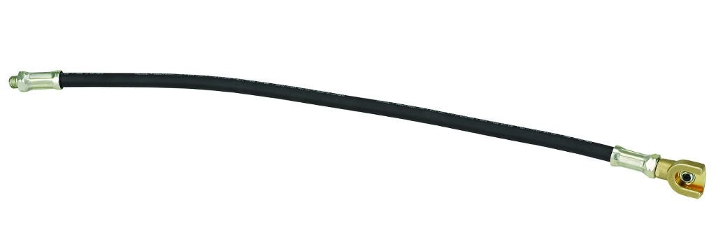 Vysokotlaková pancierová hadica 11 x 500 mm s polyuretánovým plášťom a s mosadznou násuvnou mazacou spojkou / hubicou pre ploché mazacie hlavice Ø 16 mm (12 062 125), vonkajší závit G 1/8", minimálny tlak pre roztrhnutie 900 bar, rozmery 520 x 20 x 23 mm.